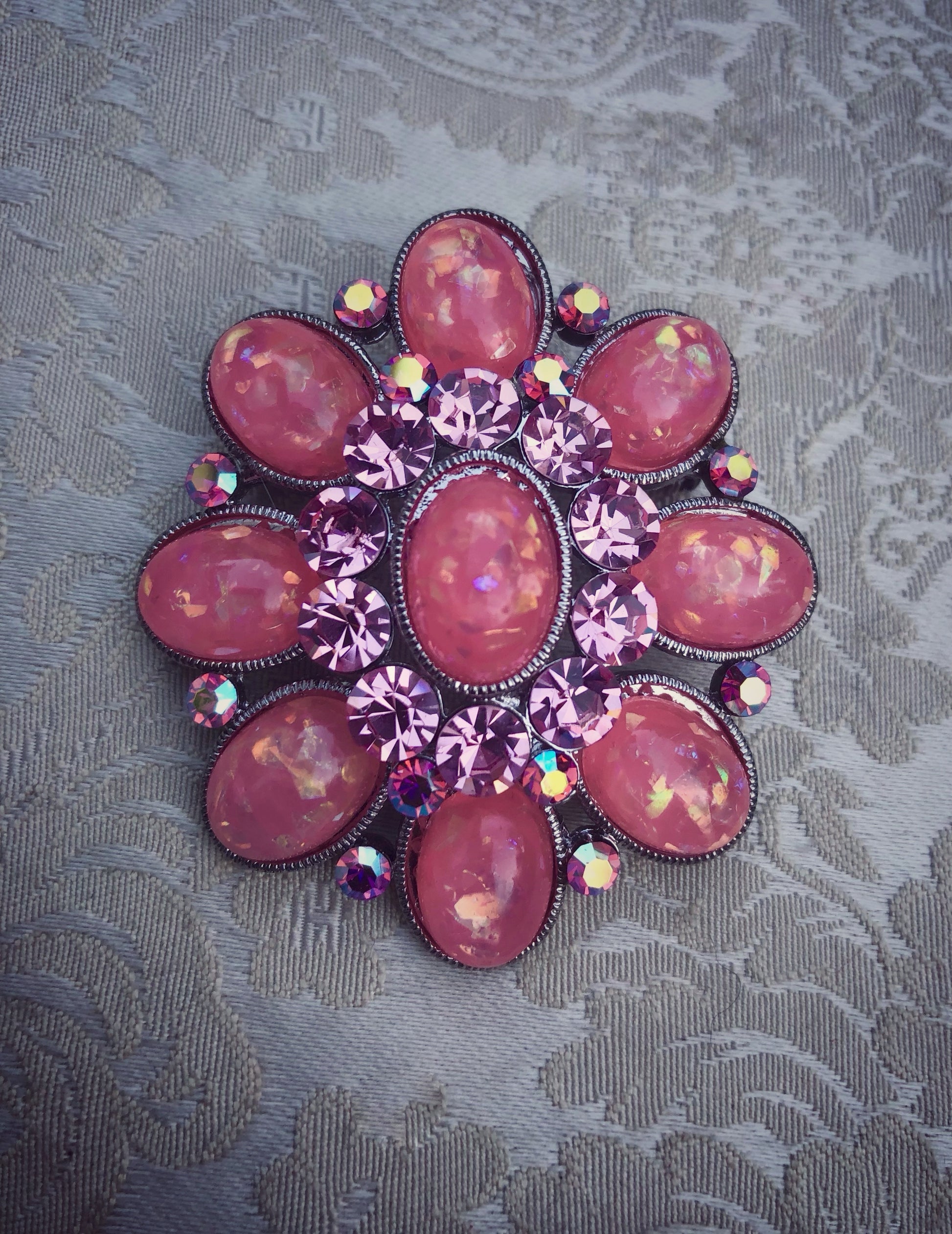 This beautiful oval shaped brooch is made with a mix of Resin and a cluster of crystals to give a subtle elegant sparkle. Just enough to be noticed not too much to glare!
