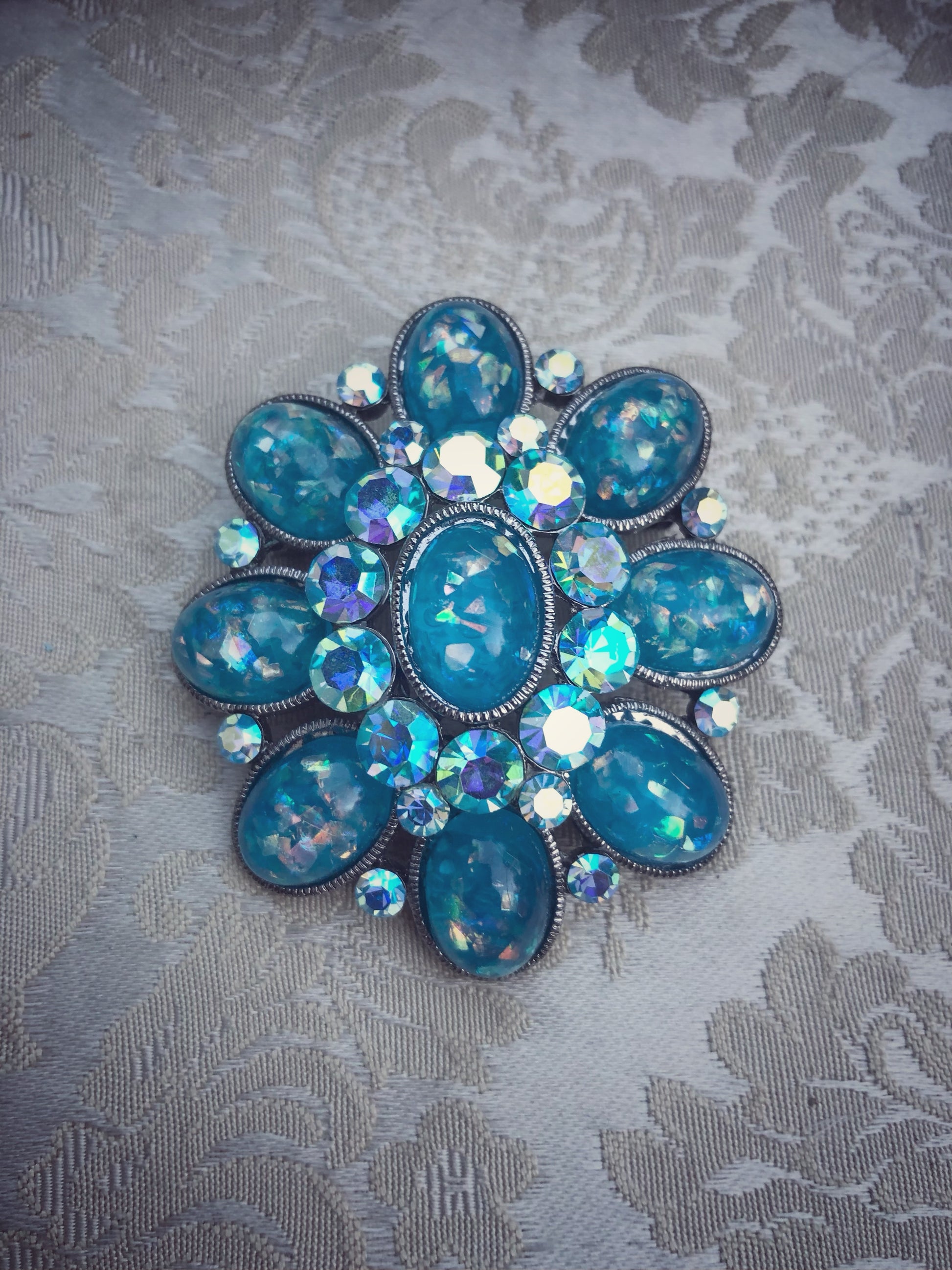 This beautiful oval shaped brooch is made with a mix of Resin and a cluster of crystals to give a subtle elegant sparkle. Just enough to be noticed not too much to glare!